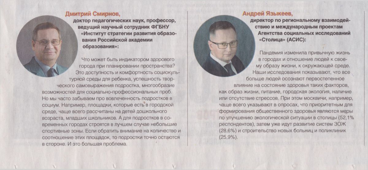 По итогам Форум «Здоровые города России» с международным участием, ведущая газета городского комплекса градостроительной политики и строительства города Москвы «МОСКОВСКАЯ ПЕРСПЕКТИВА опубликовала тезисы экспертов в т.ч. от МОО «Международная академия детско-юношеского туризма и краеведения имени А.А. Остапца-Свешникова» : Смирнова Дмитрия Витальевича и Языкеева Андрея Николаевича
